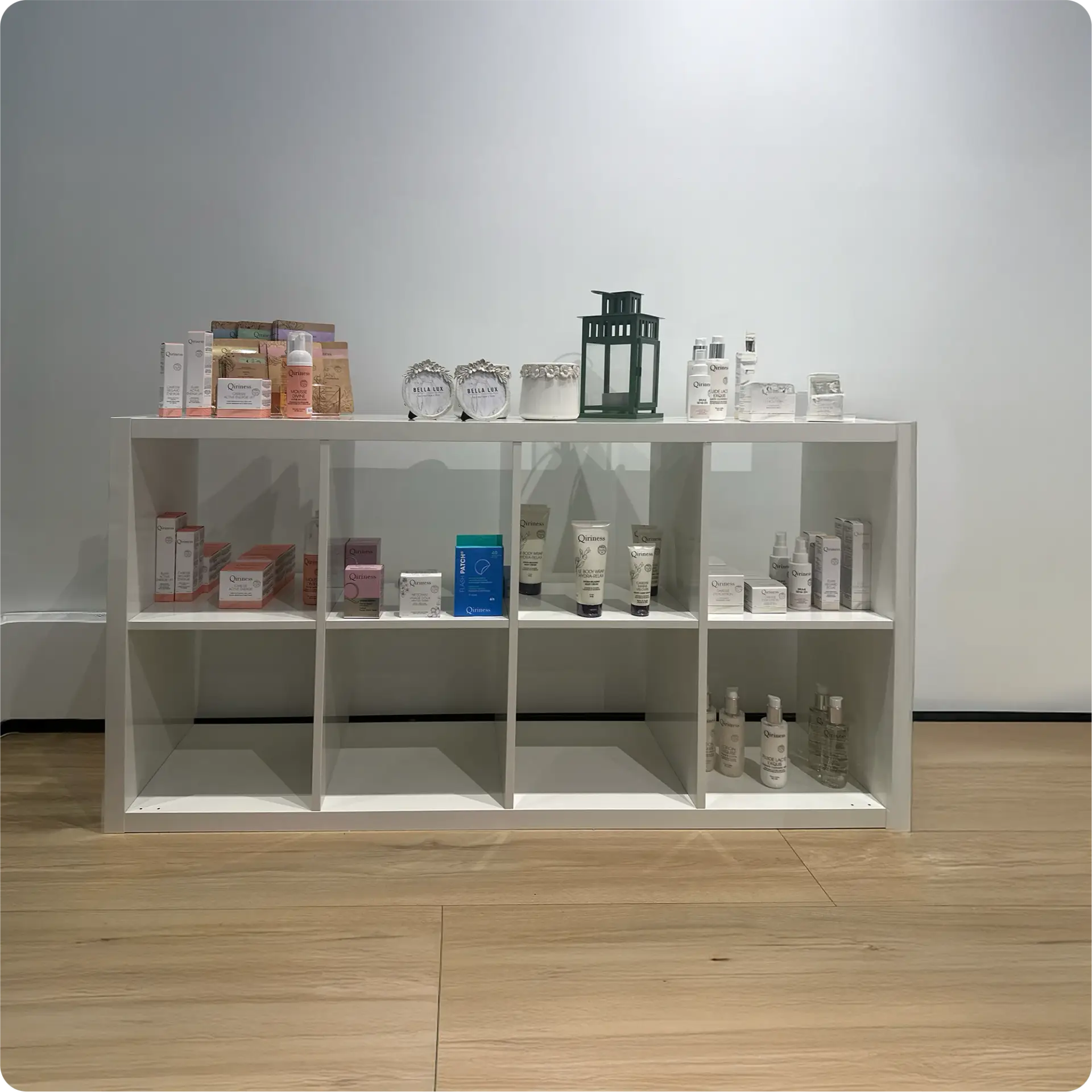 Wide horizontal shelf unit with 4 compartments arranged side-by-side. Designed for displaying larger or bulkier items with easy access and high visibility. Ideal for retail or exhibition spaces requiring broad surface areas.