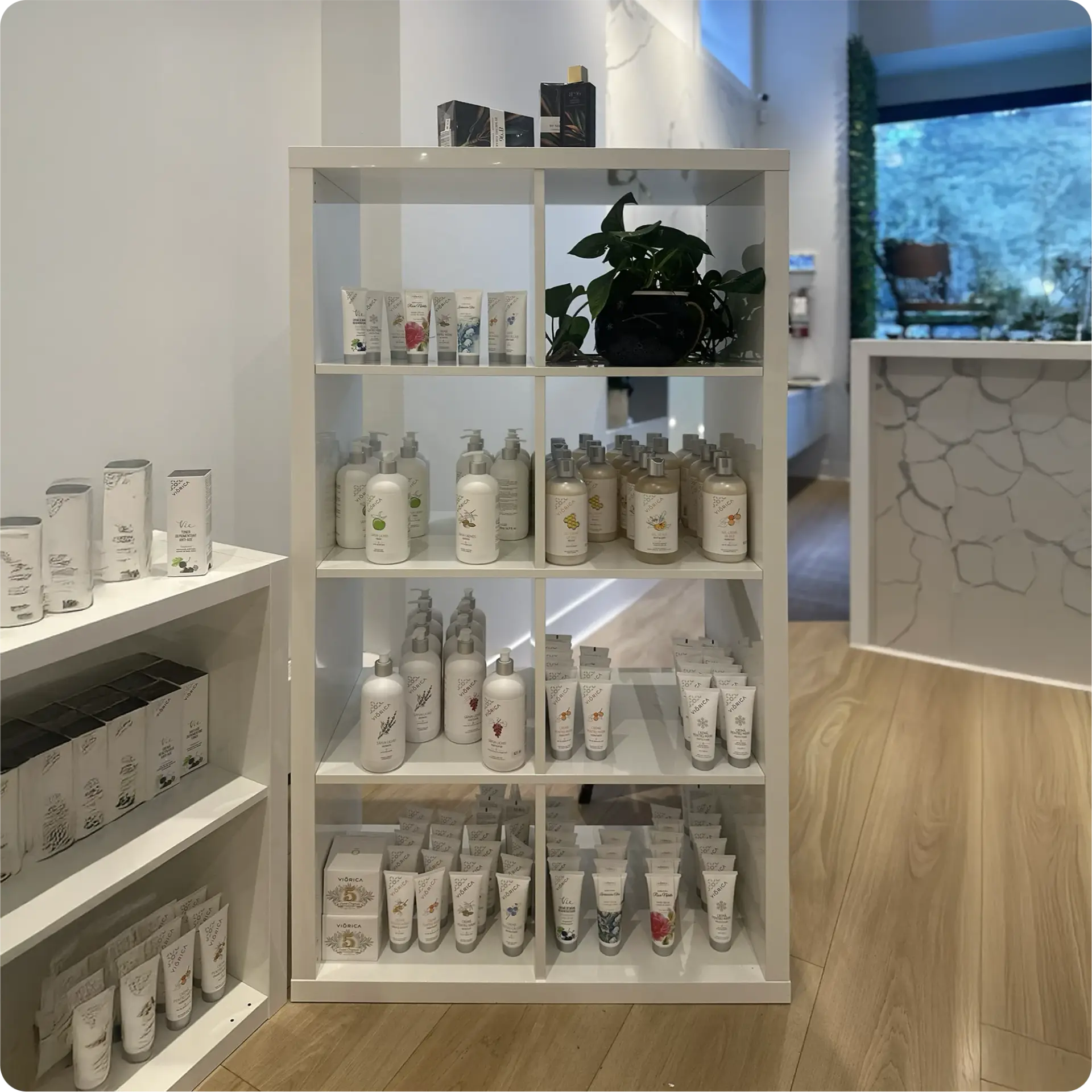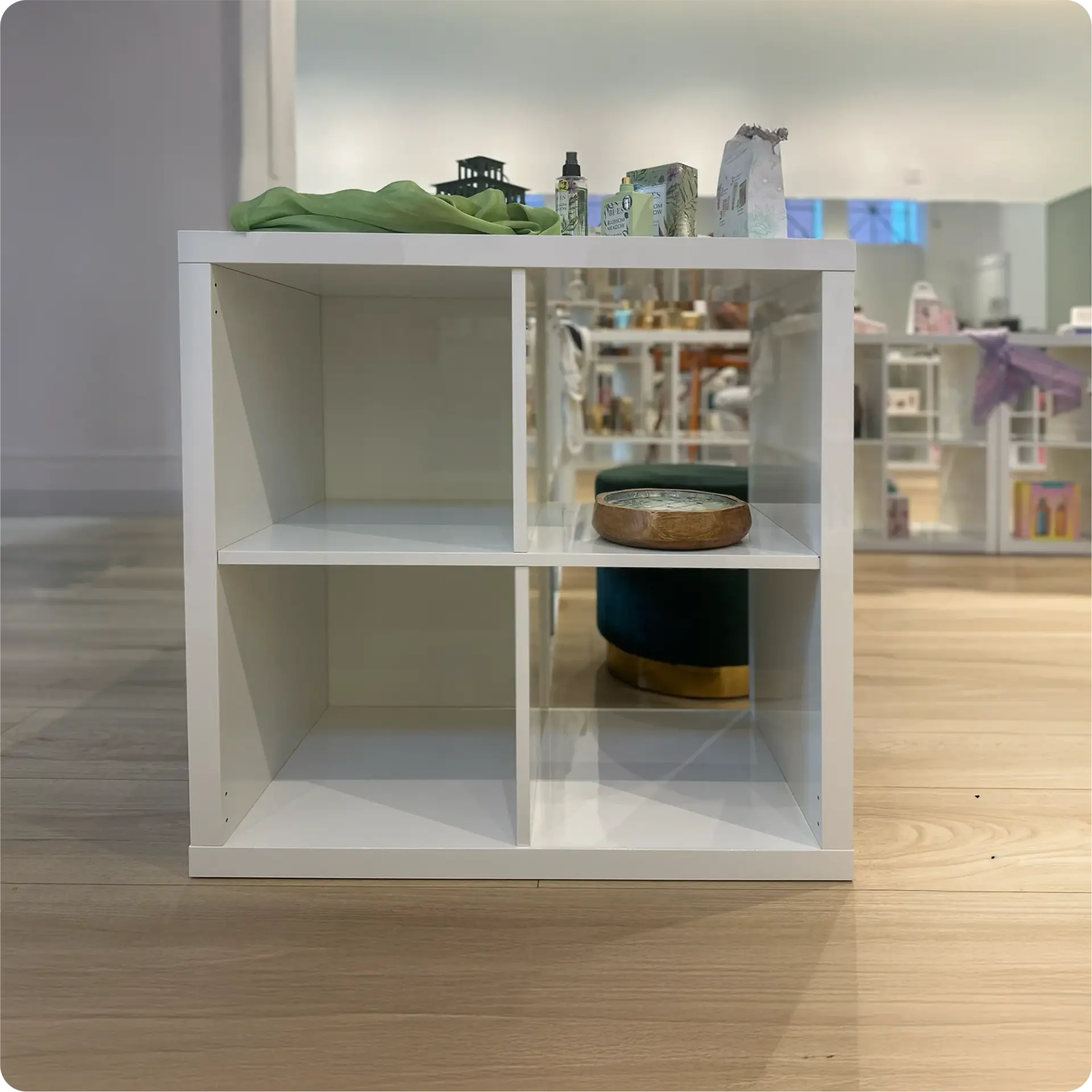 Compact square shelving unit featuring 4 compartments arranged in a 2×2 grid. Perfect for smaller spaces or versatile display arrangements. Ideal for showcasing smaller items or organizing collections neatly.