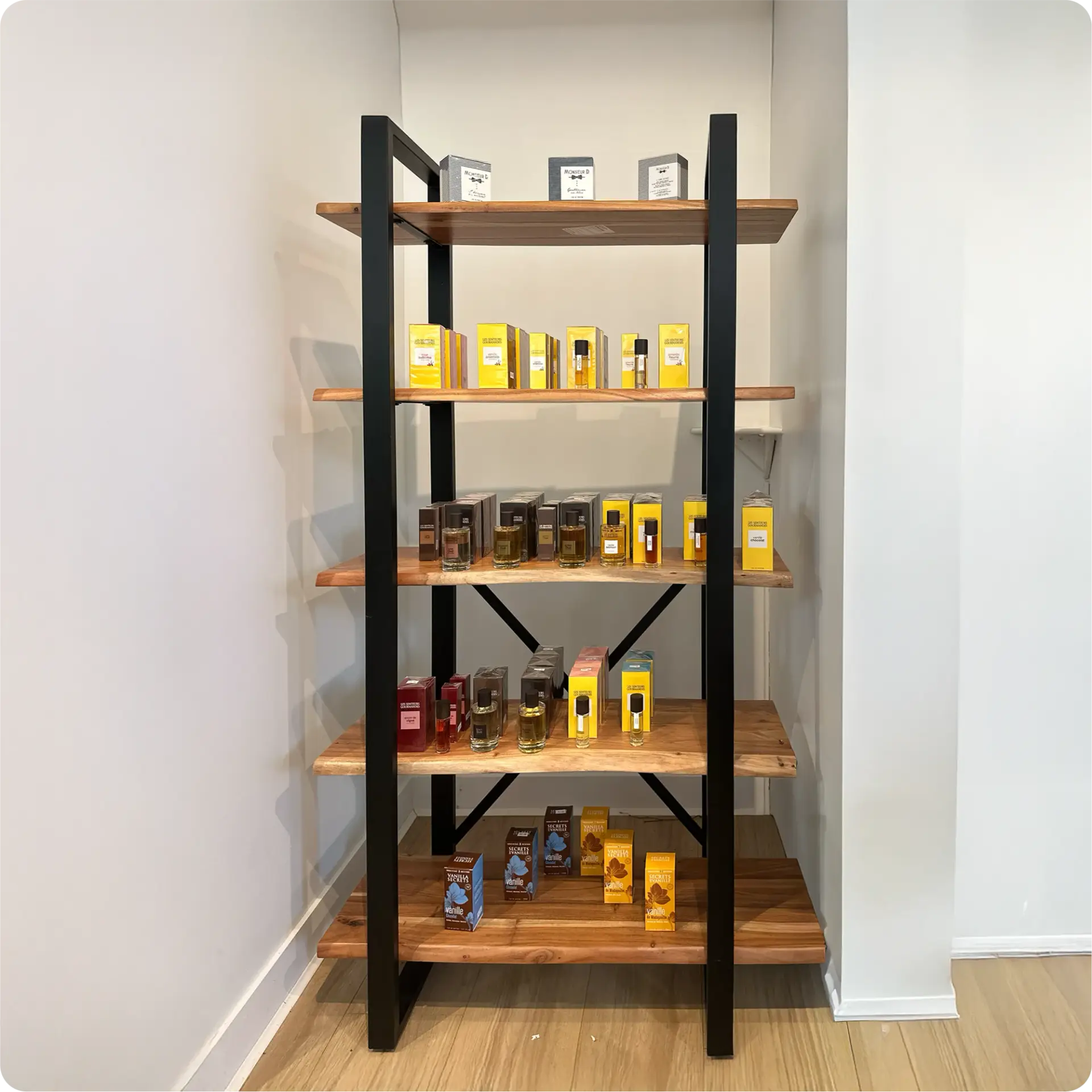 Vertical shelf unit with 5 display levels (L1 bottom to L5 top). Combines the warmth of wood with industrial metal accents, offering a versatile and attractive display solution for creative spaces. Ideal for showcasing products, artwork, or curated displays.